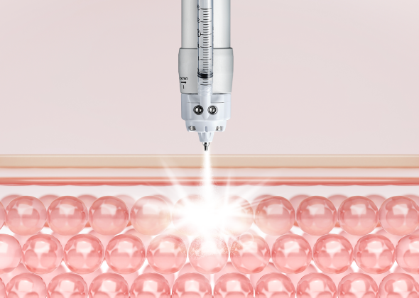 キュアジェットは、針やメスを一切使用せず、高圧のジェット噴射の力で有効な薬剤を肌の深部へ導入するニードルフリーのスキンブースター施術です。