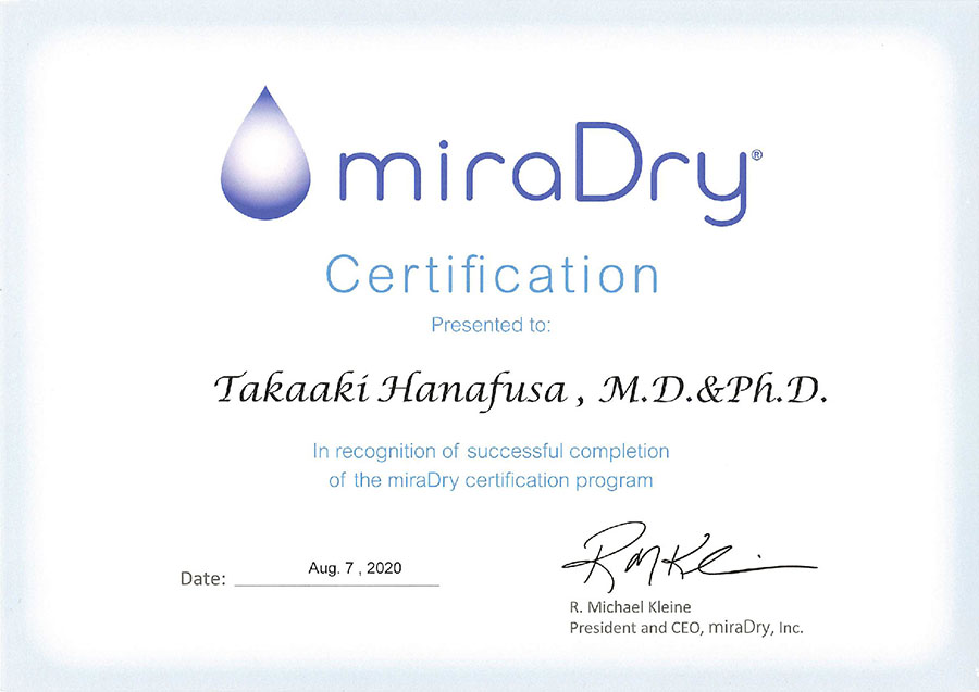 当院の理事長は、高度な知識と豊富な経験を持つ医療従事者のみに与えられるミラドライ公式認定医資格を取得しております。この認定資格は、ミラドライ治療に関する深い専門知識と、患者様一人ひとりに合わせた適切な施術技術を有することを、製造元が公式に認めるものです。ワキガ・多汗症治療はデリケートであり、治療経験や技術によって効果に差が出やすい分野です。公式認定医である理事長が指導する花ふさ皮ふ科グループの医師・看護師が治療計画から施術に至るまで責任を持って担当することで、患者様は最高水準の安全性と最大限の効果を両立した治療を、心から安心して受けていただけます。当院は、公式認定医による確かな技術指導で、患者様の長年の悩みを「たった1回」の施術で解消することを目指します。